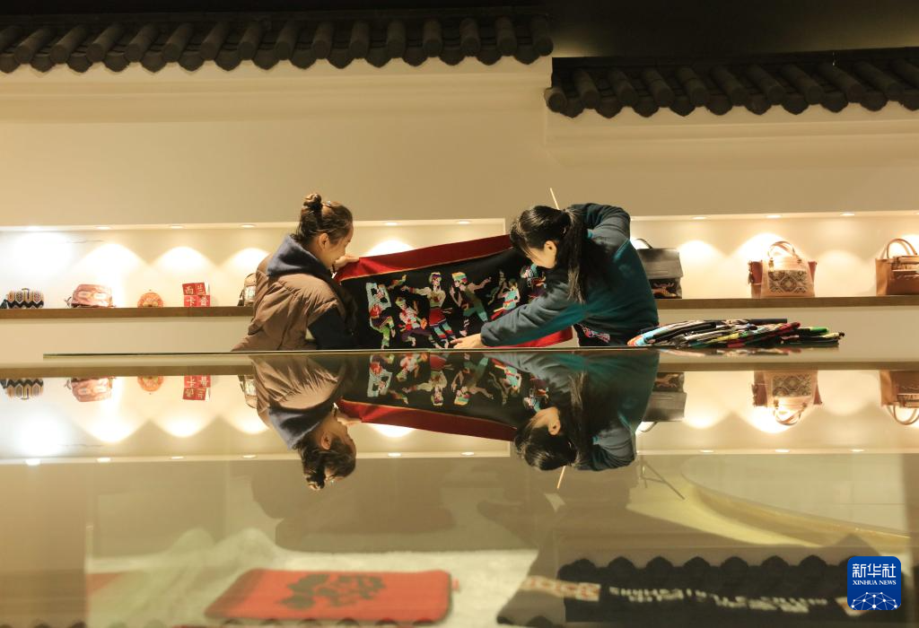 11月12日,在張家界市武陵源區(qū)乖幺妹土家族織錦基地,工人在檢查土家族織錦產(chǎn)品質(zhì)量。