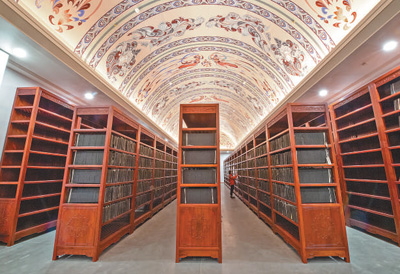 國家版本館中央總館,工作人員在雕版庫房內(nèi)巡查。