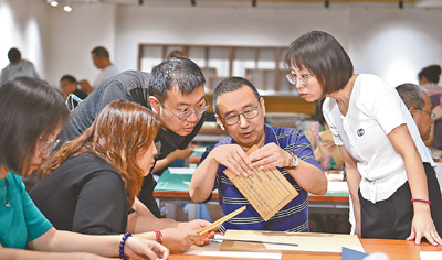 山西省圖書館,來自國家圖書館的古籍修復(fù)專家劉建明(右二)在給該省第一期古籍修復(fù)培訓(xùn)班的學(xué)員們講解古籍修復(fù)技巧。