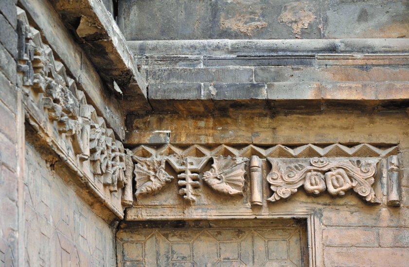 ▲原平魏家莊大門(mén)磚雕,拱眼壁雕刻“余慶”二字,寓意要給后代遺留福澤;額枋雕刻海上宮闕、仙鶴瑞草紋飾,建于清代。