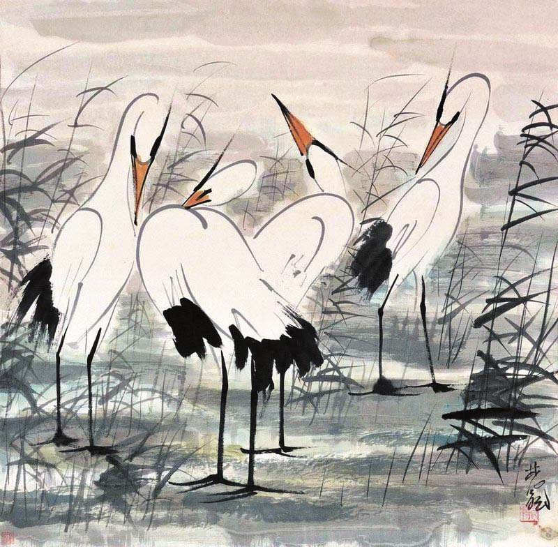 到了近現(xiàn)代,傳統(tǒng)文藝思想開始發(fā)生轉(zhuǎn)變,呂澂、康有為等人在繪畫領(lǐng)域提出改良思想,鶴主題的繪畫也有所變化。在林風(fēng)眠創(chuàng)作的《群鶴圖》《雙鶴圖》《白鶴》等作品中,既可以看到中國畫白描的影子,又可以感受到西方速寫技法的影響。《群鶴圖》由幾只立于廣袤水草的白鶴構(gòu)成,它們姿態(tài)各不相同。與鶴之閑適姿態(tài)相對(duì)應(yīng)的是隨風(fēng)浮動(dòng)的蘆葦,它們?cè)谖L(fēng)吹拂下雖形態(tài)萬千,但并不雜亂,在總體偏暗的色調(diào)中顯出和諧之味?!峨p鶴圖》表現(xiàn)了鶴的輕盈姿態(tài),兩只鶴步伐保持一致,展示出閑適自得之感。林風(fēng)眠筆下的鶴,顯然沒有古代繪畫中仙風(fēng)道骨、富貴長壽之意,與寫意之鶴相比,其作品里的鶴與自然萬物融為一體,表達(dá)出強(qiáng)有力的現(xiàn)代語言。