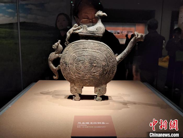 觀眾在展覽現(xiàn)場(chǎng)欣賞鳳蓋蟠龍紋銅盉。趙曉 攝