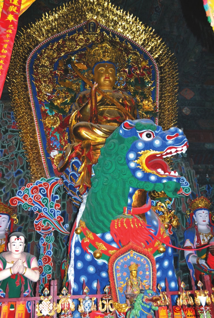 五臺(tái)山殊像寺大文殊殿里騎著狻猊的文殊菩薩塑像 高峰毅攝