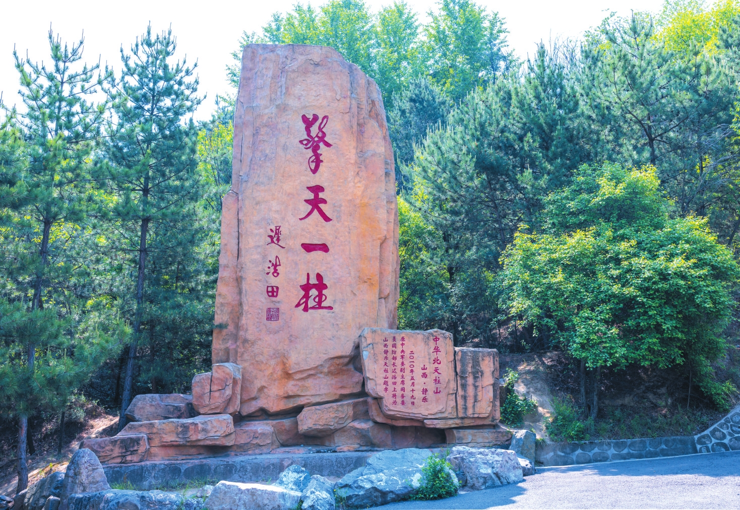 山路向南急轉(zhuǎn)后變得平坦舒緩起來(lái),氣勢(shì)恢弘的建筑群呈現(xiàn)在眼前。右邊護(hù)坡上,是天柱山的“名人墻”,鑲嵌著靜樂(lè)九大名人的肖像,有功蓋千古的賢相,有戰(zhàn)功赫赫的名將,有學(xué)識(shí)淵博的鴻儒,有英勇無(wú)畏的革命者。不遠(yuǎn)處,一塊赭色大石莊嚴(yán)矗立,上面是中央軍委原副主席遲浩田上將于2010年5月為天柱山的題詞:擎天一柱。將軍蒼勁有力的書法,與山之威武相得益彰。