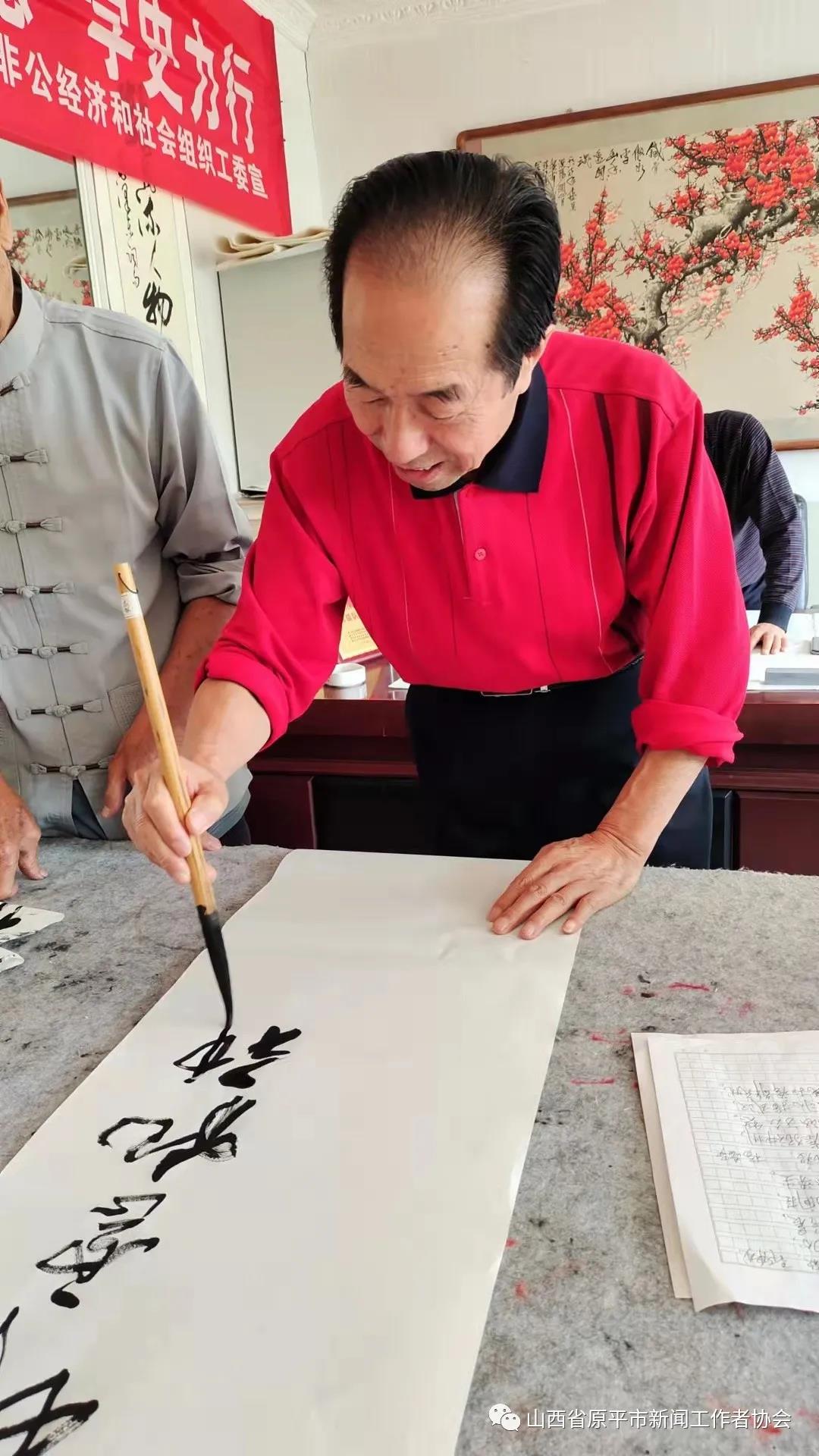 活動現(xiàn)場,大家暢所欲言,紛紛聯(lián)系思想實(shí)際,交流了學(xué)習(xí)黨史、明理知進(jìn)的心得體會,圍繞學(xué)史長知、學(xué)史明理、學(xué)史增信、學(xué)史興業(yè)進(jìn)行了熱烈討論。接著,書畫藝術(shù)組的書法家亢銀中、趙存仁、王玉伍、張正山、王福歲、王弘新,及學(xué)會顧問書畫名家溫樹森老師、以及特邀書畫名家李晉復(fù)先生,紛紛揮毫潑墨,書寫出學(xué)習(xí)黨史的感悟與名言。大筆揮灑中,一幅幅寫有“賡續(xù)精神血脈、傳承紅色基因”“明理增信.崇德力行”“不忘初心、牢記使命”和“江山就是人民、人民就是江山”等字樣的真、草、隸、篆、行書藝作品,從筆下飄然而出。墨香中呈現(xiàn)出各有千秋、韻味感人的風(fēng)格,博得觀賞者們的點(diǎn)贊稱道,并爭相拿到一幅贈品。書法家們顧不上喝水,整整忙了一個(gè)上午。特別是書畫藝術(shù)組組長李文光,由于平時(shí)在廣州忙于接送孩子上學(xué),放暑假回原平后特地趕來,高興地跟大家一起切磋書藝、展示才藝。書法家們還探討了書法藝術(shù)融入社會、融入黨性、服務(wù)大眾、服務(wù)中心的蹊徑、舉措與打算。(賈宣生 王福歲)