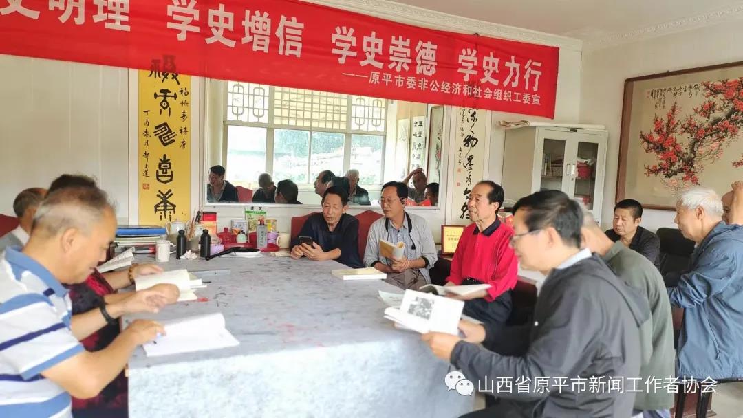近日,原平市老年新聞文化學(xué)會組織開展了一次以學(xué)黨史悟思想為主旨的專題筆會活動。學(xué)會會長楊愛英、學(xué)會黨支部書記劉興良跟學(xué)會書畫藝術(shù)組成員一起,在這秋高氣爽、陽光燦爛的日子里,以滿腔熱情來到學(xué)會辦公中心柳巷牡丹園,參加了這一集研討和書法于一體的別開生面的活動。學(xué)會文化合作單位增壽口腔、金色童年、萬源石雕與奶爸奶媽等單位人員,以及部分書畫愛好者共近50人,共同分享了書藝交流的喜悅。