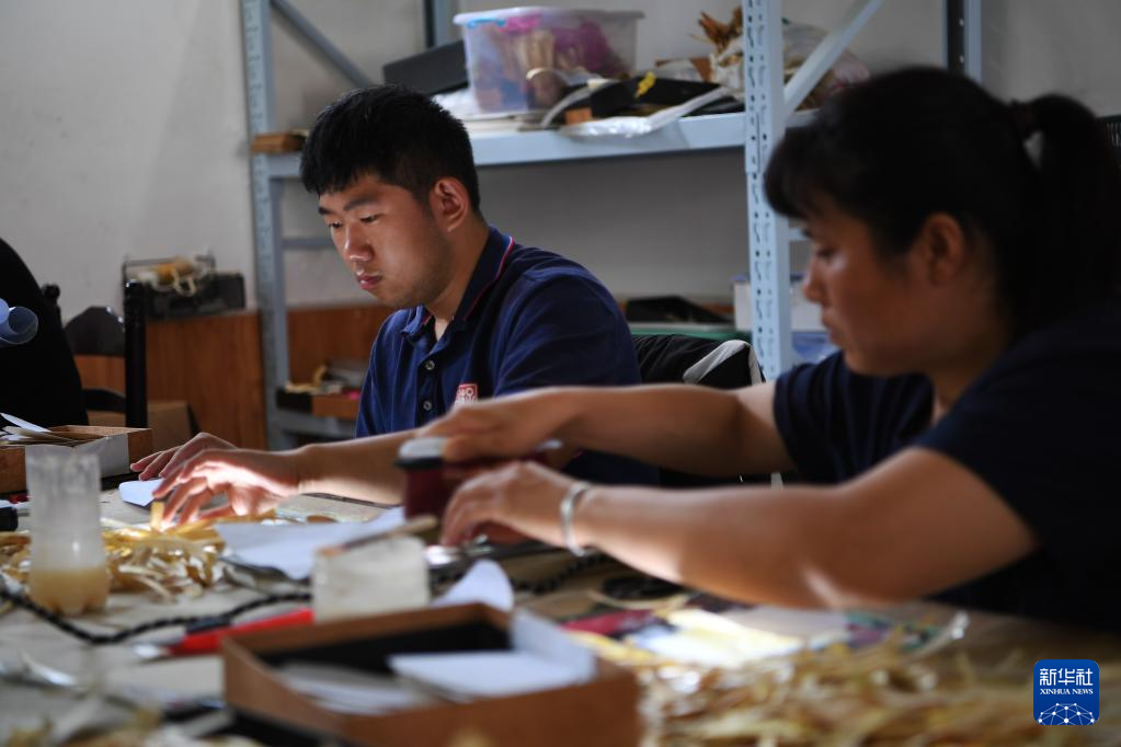 5月17日,張富揚(左)在非遺傳習(xí)基地制作蘆葦畫。