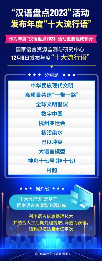 新華社北京12月6日電(記者史競男)作為年度“漢語盤點(diǎn)2023”活動(dòng)重要組成部分,國家語言資源監(jiān)測與研究中心12月6日發(fā)布年度“十大流行語”,分別是:中華民族現(xiàn)代文明、高質(zhì)量共建“一帶一路”、全球文明倡議、數(shù)字中國、杭州亞運(yùn)會(huì)、核污染水、巴以沖突、大語言模型、神舟十七號(hào)(神十七)、村超。