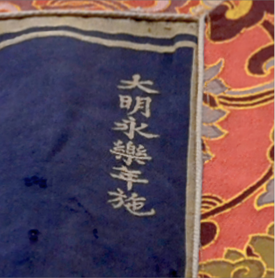 ▲明永樂織錦勝樂金剛唐卡右上角六字金色漢文楷書“大明永樂年施”題款。