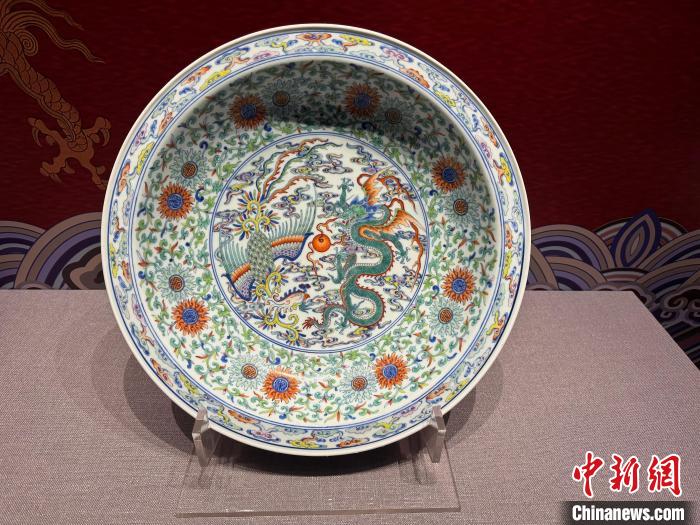 沈陽(yáng)故宮院藏國(guó)家一級(jí)文物“清雍正斗彩龍鳳紋大盤”。記者 韓宏攝