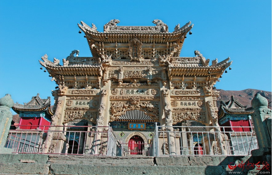 寺中的影壁、牌坊、墓塔是三件藝術(shù)瑰寶。影壁和牌坊與東院處在一條中軸線上,由108級(jí)石板臺(tái)階相連。臺(tái)階底部的照壁,正中所嵌一組漢白玉石雕,可以看作五臺(tái)山風(fēng)景名勝區(qū)主要寺廟的微縮示意圖。而臺(tái)階上面的三門(mén)四柱牌坊更為精致壯觀,全部用漢白玉雕造而成,前后垂檐和三門(mén)拱券采用鏤空雕法,玲瓏剔透,整個(gè)牌樓雕滿飛龍、花梁、紙扇、寶鏡、書(shū)筆、塵撣、玉壺等多種圖案,形象逼真。這座民國(guó)年間用10年時(shí)間雕成的牌坊是近代雕刻藝術(shù)的稀世之寶。牌坊后面的東大院前后兩進(jìn),有天王殿、觀音殿、大佛殿等建筑。