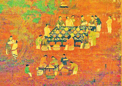 宋代面食既有團(tuán)子狀、面疙瘩狀的,也有薄片狀、條狀的,前者可以用湯匙吃,后者多用筷子吃。此外,《東京夢(mèng)華錄》中還詳細(xì)介紹了宋代餐廳的外觀、菜肴及客人點(diǎn)菜方法:“每店各有廳院東西廊,稱呼坐次??妥瑒t一人執(zhí)箸紙,遍問坐客?!贝笠馐钦f,每家店都有廳堂、庭院、東西廊,待客人落座,店家便送上筷子、紙花,詢問客人要吃些什么。