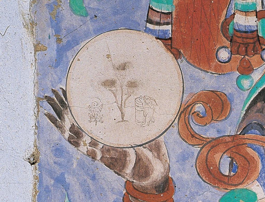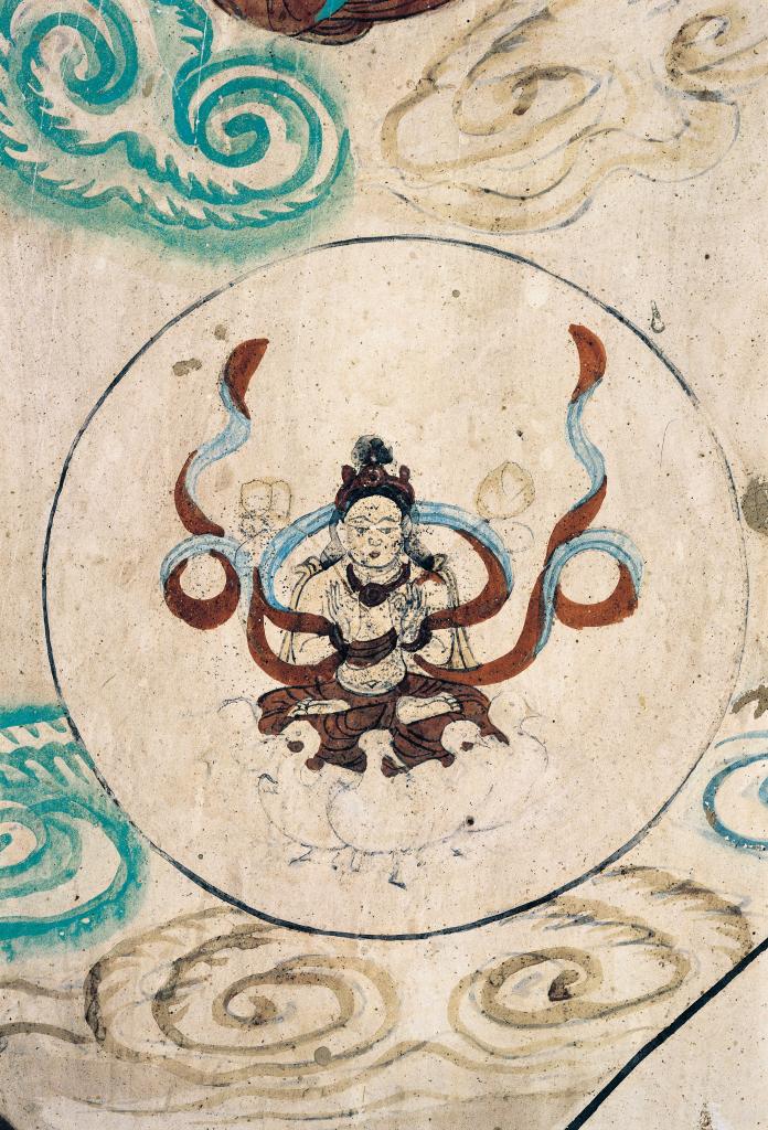 莫高窟第35窟-菩薩手中的月亮(特寫)-五代 月神長什么樣?莫高窟第384窟的壁畫上,描繪著一尊身呈白色、乘于鵝座的月光菩薩,菩薩手持月輪,仙衣飄飄。在莫高窟第285窟內(nèi),東西方的日月神匯聚一堂。西方的日月神乘車駕,中國的日月神駕于云氣之上。