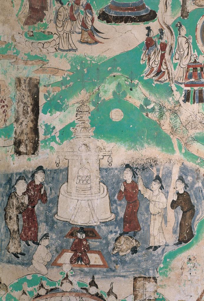 莫高窟第384窟-月光菩薩-中唐 “皓魄當(dāng)空寶鏡升,云間仙籟寂無聲?!币栽聢A兆團圓,狀若銀盤的滿月,勾起古人對美滿團圓的期盼,他們用各種各樣的方式表達對月亮的樸素崇拜。 花好月圓夜,人們擺設(shè)香案、放置供品,敬奉月神。敦煌研究院介紹,在莫高窟第103窟的壁畫中,描繪了古人們頭頂明月、圍繞寶塔祭拜的場景。