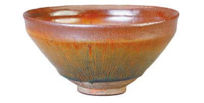 曜變建盞是建窯瓷器的名貴品種,可遇不可求,呈現(xiàn)為釉面散布大小不一的稀疏空心狀斑點,斑點外緣隨光線散發(fā)出紅、綠、天藍等彩色光暈。光暈之外是流光溢彩的豎向絲毫,色彩豐富且有立體感,猶如天上的群星浩瀚深邃。