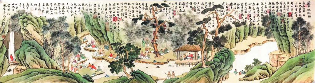 東晉永和九年(353年)上巳節(jié),會稽內史王羲之和謝安、孫綽等人在山陰蘭亭修禊,曲水流觴,飲酒賦詩,所作詩歌后來結集為《蘭亭集》,王羲之為之撰序,即被稱作“天下第一行書”的《蘭亭序》,而蘭亭雅集的詩酒風流也成為千古佳話。在后世仿效的各類蘭亭雅集中,詩歌、繪畫、書法等多種藝術元素爭奇斗艷,形成華麗精致、傳承千載的文化景觀。