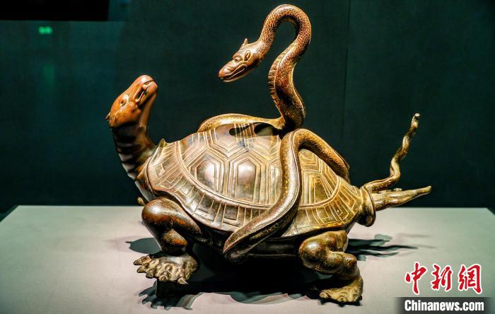 據(jù)介紹,玄武是中國(guó)古代傳說中鎮(zhèn)守北方的神獸,往往以龜蛇合體的形象出現(xiàn)。漢代以來,龜蛇作為玄武神的象征受到人們奉祀,后被道教吸收后將其人格化,逐漸成為道教的大神。