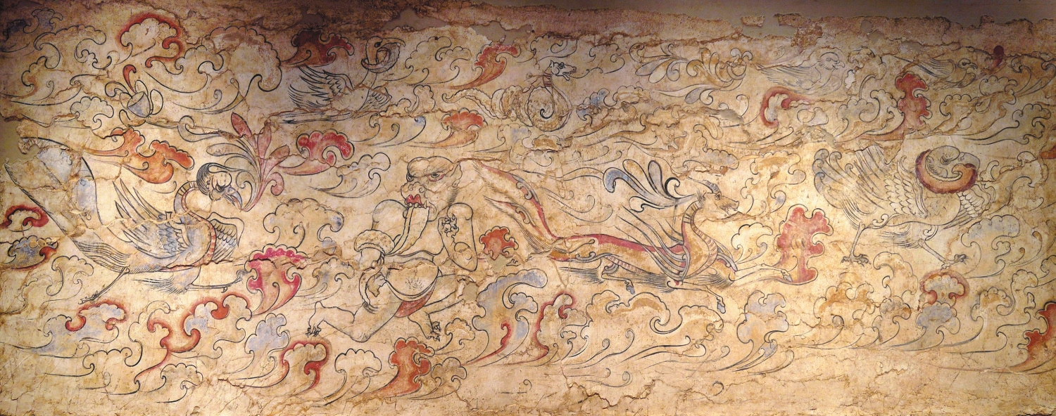 忻州北朝墓墓道東西兩壁的壁畫非常令人震撼,是同時期墓葬壁畫中保存較完整、精細的一處,對研究北朝社會生活、繪畫藝術、古代建筑史都有非常重要的意義。壁畫第一層為升天景象,繪有神怪異獸、龍鶴仙人、風伯雨師等形象;第二層以郁郁蔥蔥的山林為背景,描繪了備馬出行和狩獵場景;第三、四層依舊以山林為背景,繪有隊列出行圖。此外,墓道北壁還繪有一座規(guī)模宏大的廡殿頂木結構建筑。墓室壁畫雖遭破壞,但分層圖像依稀可見,布局基本清楚。第一層為星象圖,東壁上方還殘存三足烏的形象;第二層為四神圖,形體巨大;第三層為牛車鞍馬圖,其中東壁為牛車,西壁為鞍馬,華蓋羽傘,隨行人物依稀可辨。