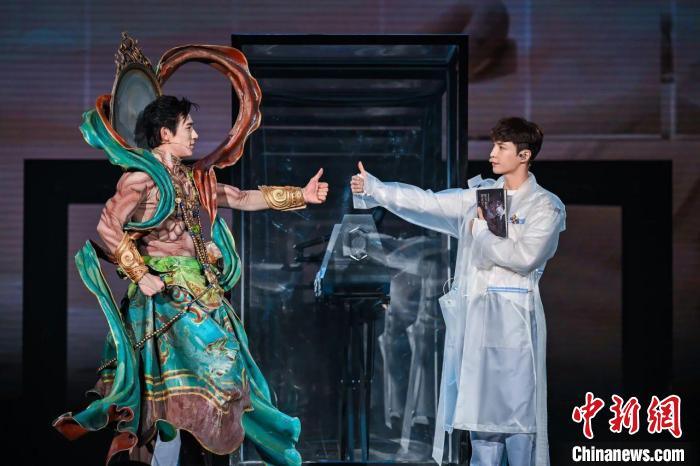 《受到召喚·敦煌》運用了“AI+3D+即時影像+真人動畫融合”技術(shù),以高色階大屏,打破了傳統(tǒng)的觀演模式和舞臺空間,巧妙地融合了歷史與未來、東方與西方文化元素,構(gòu)建起沉浸式觀演空間。舞臺上,當數(shù)字修復的莫高窟壁畫徐徐展開時,21世紀30年代的敦煌數(shù)字研究中心實習生張燃與20世紀30年代的“敦煌守護神”常書鴻,跨越一個世紀,展開時空對話,給現(xiàn)場觀眾留下了深刻印象。