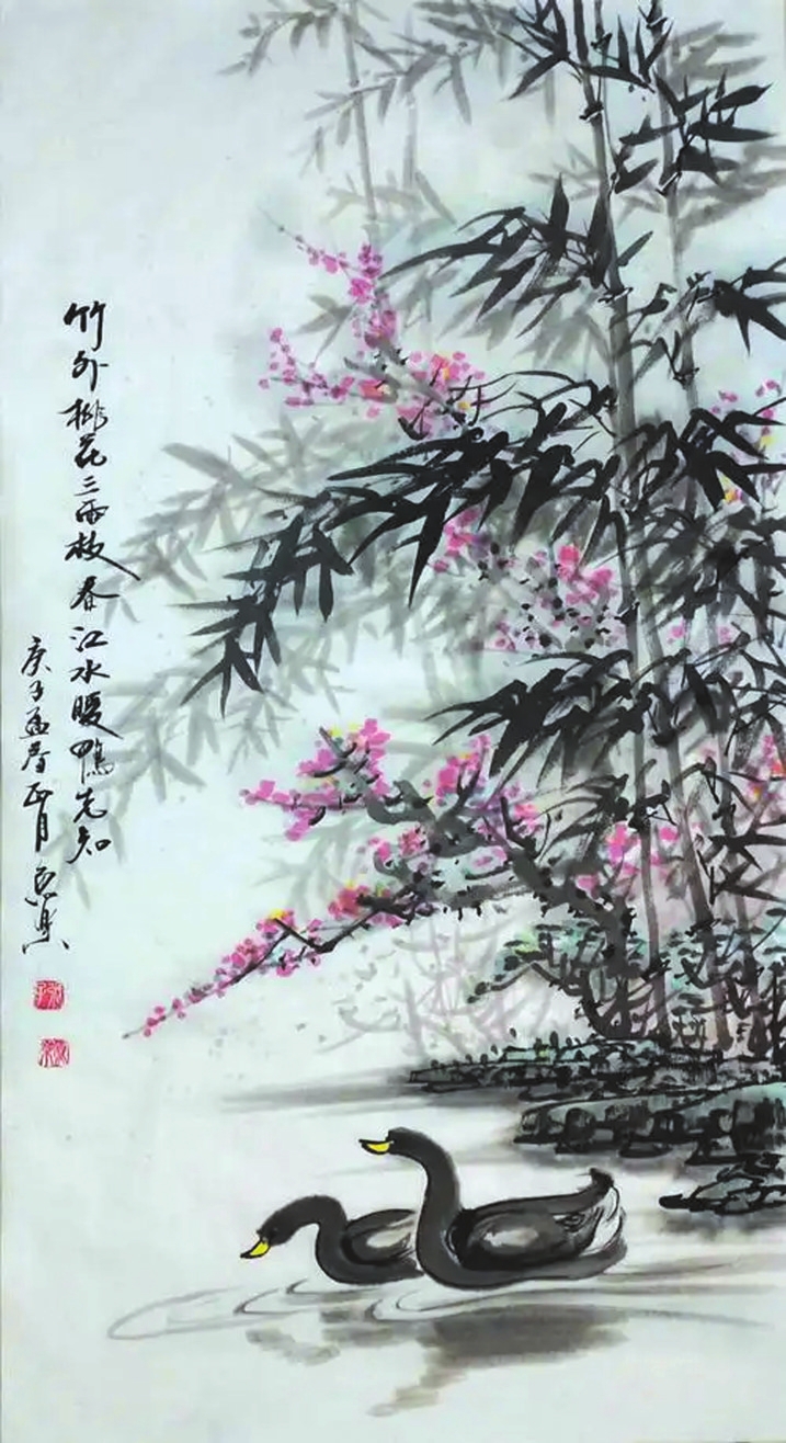 數(shù)字點(diǎn)染,精妙難言。古詩(shī)中常用數(shù)字實(shí)寫事物,前呼后應(yīng)形成點(diǎn)染。蘇軾《惠崇春江晚景》中寫“竹外桃花三兩枝,春江水暖鴨先知”,先以“三兩枝”具體描寫桃花零星開(kāi)放的實(shí)景,渲染初春的環(huán)境氣氛,再以“春江水暖鴨先知”點(diǎn)明題旨?!叭齼芍Α辈欢嗖簧偾〉胶锰帲c(diǎn)出初春的景物特征——少則春寒料峭,過(guò)于冷寂,多則春意盎然,稍嫌熱鬧,都無(wú)法與后文“春江水暖鴨先知”對(duì)季候變化的感悟相呼應(yīng)。葉紹翁的《游園不值》云“春色滿園關(guān)不住,一枝紅杏出墻來(lái)”,先點(diǎn)出“春色滿園”的主旨,再以“一枝紅杏”具體渲染春天壓抑不住的蓬勃生機(jī),以及作者游園不成忽見(jiàn)“春色”破墻溢出的驚喜。這個(gè)“一”是其余數(shù)字替代不了的,數(shù)字點(diǎn)染,準(zhǔn)確精當(dāng),妙不可言。