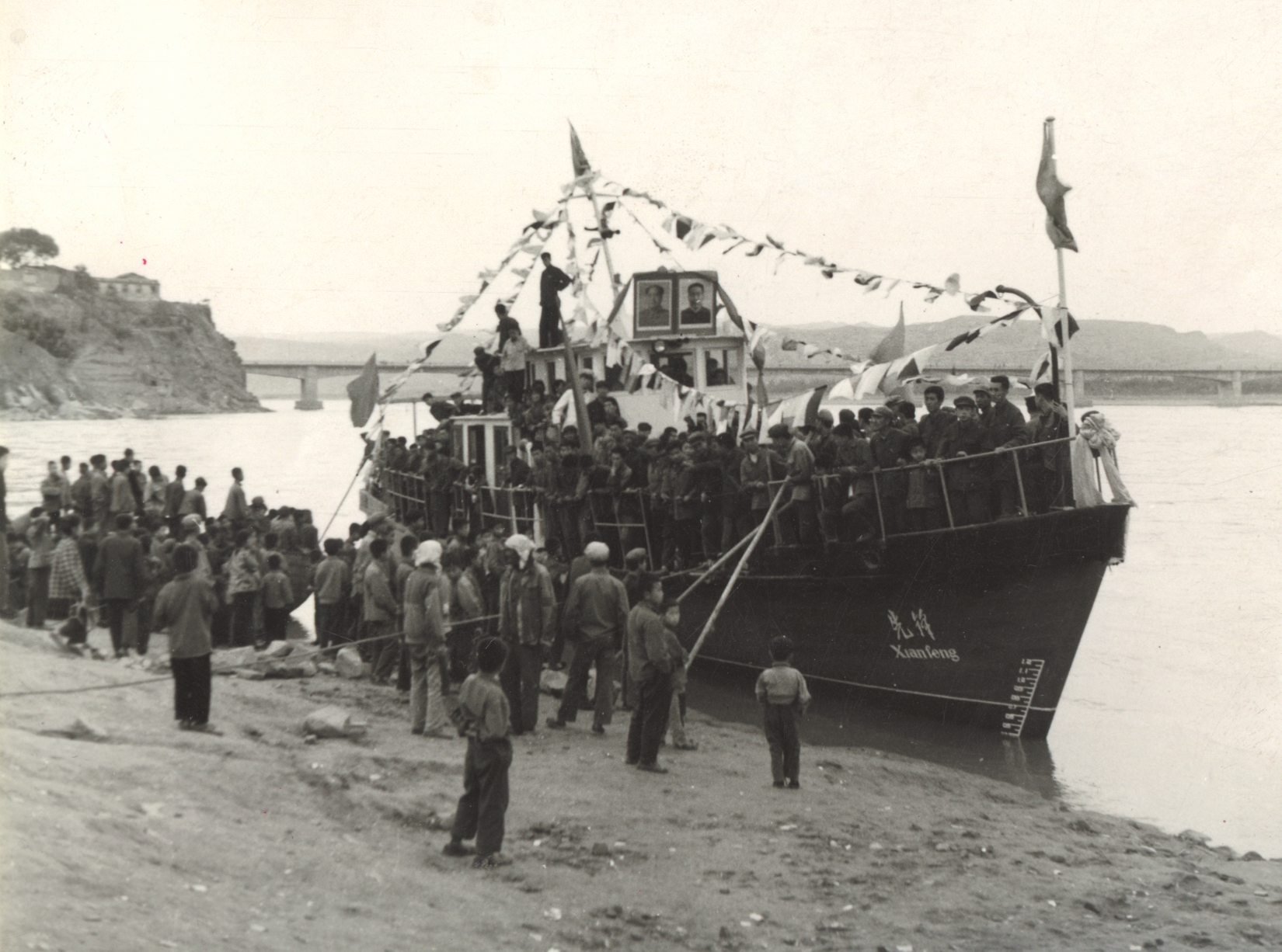 保德縣的木船造得快,取名“先鋒號(hào)”,于1977年5月23日,農(nóng)歷四月初六正式下水。這是晉陜峽谷有史以來(lái)第一艘機(jī)動(dòng)船,千年未有之新鮮事,少不了要隆重慶賀。有老照片記錄當(dāng)年盛況:黃河水流浩大,“先鋒號(hào)”泊于岸邊,駕駛艙頂上并排矗立著偉人的大幅畫(huà)像,上用紅綢花裝飾,船頭船尾紅旗招展,四條彩帶從駕駛艙頂端連向船沿。縣領(lǐng)導(dǎo)排坐于船上,禮儀小姐扯著紅綢,河岸上站滿了看熱鬧的群眾。河風(fēng)吹動(dòng)大小旗幟,機(jī)船顯得威風(fēng)凜凜。