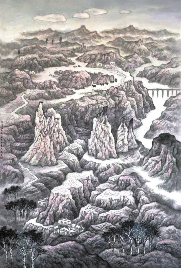 周建國對中國山水畫有著獨(dú)特見解,出版過畫集《中國美術(shù)名家精品鑒賞·周建國作品集》。他的創(chuàng)作之路主要分為兩個時期,前期追求中西融合,后期則回歸傳統(tǒng)。前期作品《曉月》《古原除夕》《月色》等,多取材于黃土高原,真切流露出其對黃土地的深情厚愛:早上飄起的炊煙演繹著百姓的勤勞,喧鬧的腰鼓彰顯著鄉(xiāng)民熱愛生活的豪情,晨起上課的學(xué)生更是承載著當(dāng)?shù)厝藵M滿的希望。周建國將黃土地上的一草一木皆升華為獨(dú)特且富有個性的生命體,畫面處理側(cè)重將西方油畫的光影巧妙融入作品,寓動于靜,動靜相宜,彰顯“高貴的單純,靜穆的偉大”的內(nèi)在張力。同時將傳統(tǒng)山水繪畫的造型、空間結(jié)構(gòu)、筆法設(shè)色皆進(jìn)行改變——黃土溝壑的幾何化處理、筆墨色調(diào)的反復(fù)拿捏、耐人尋味的空間布局,都體現(xiàn)了其特殊的創(chuàng)作理念。相較前期,周建國后期的作品更加注重對內(nèi)在美的挖掘,如《風(fēng)月同天》《家園》《和諧家園》《生息之地》《太行月色》等代表作品,表達(dá)對祖國山河大川的熱愛,走“外師造化,中得心源”之道,畫風(fēng)趨向率真,試圖突破中國山水繪畫的表象審美,追尋深層意義的表達(dá)。