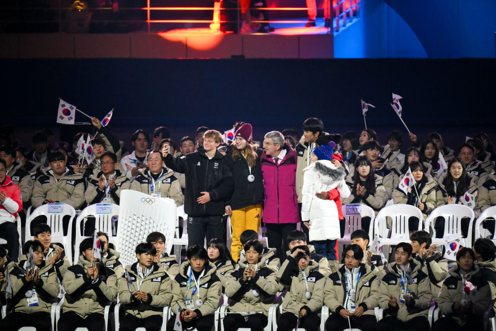 1月19日,國(guó)際奧委會(huì)主席巴赫在江陵速滑館開幕式現(xiàn)場(chǎng)與運(yùn)動(dòng)員合影。當(dāng)日,第四屆冬季青年奧林匹克運(yùn)動(dòng)會(huì)開幕式在韓國(guó)江原道江陵速滑館和平昌圓頂體育館同時(shí)舉行。新華社記者 朱煒 攝