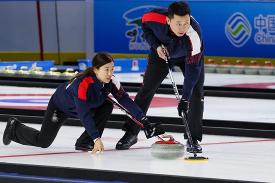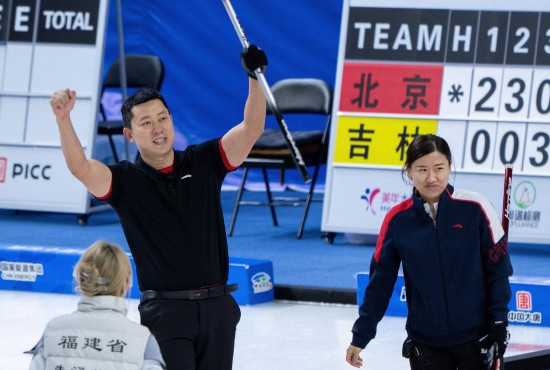 20日,在第十四屆全國冬季運(yùn)動會冰壺(公開組)混雙決賽中,黑龍江隊(duì)以7:6險勝福建隊(duì),奪得金牌。