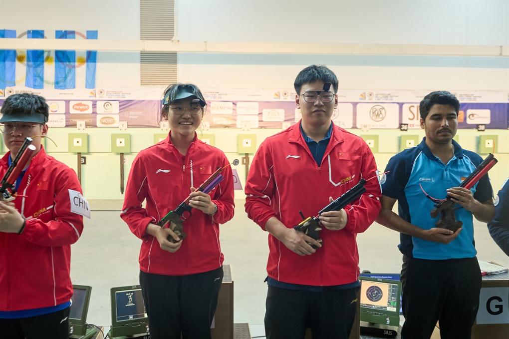 10米氣手槍混合團體冠軍張益梵(右二)/馬千珂(右三)在比賽現(xiàn)場。圖片來自國際射聯(lián)官網(wǎng)
