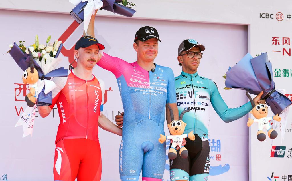 7月9日,賽段冠軍愛沙尼亞快客車隊(duì)車手拉亞斯·馬丁(中)、亞軍李寧之星車隊(duì)車手謝爾比·亞歷山大(左)、季軍意大利巴迪亞尼車隊(duì)車手扎農(nóng)塞洛·恩洛科在領(lǐng)獎(jiǎng)臺(tái)上合影。新華社記者 齊芷玥 攝