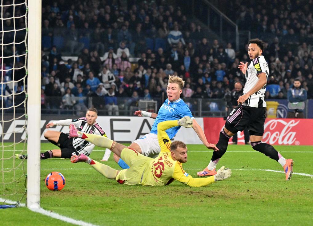 那不勒斯開場不久就有所斬獲。第七分鐘,霍伊倫接隊(duì)友內(nèi)雷斯的橫傳,近距離包抄破門。此后兩隊(duì)你來我往,上半時接近尾聲時,尤文球員凱利將絕佳機(jī)會球踢飛,而主隊(duì)麥克托米納的頭球也被立柱拒絕。