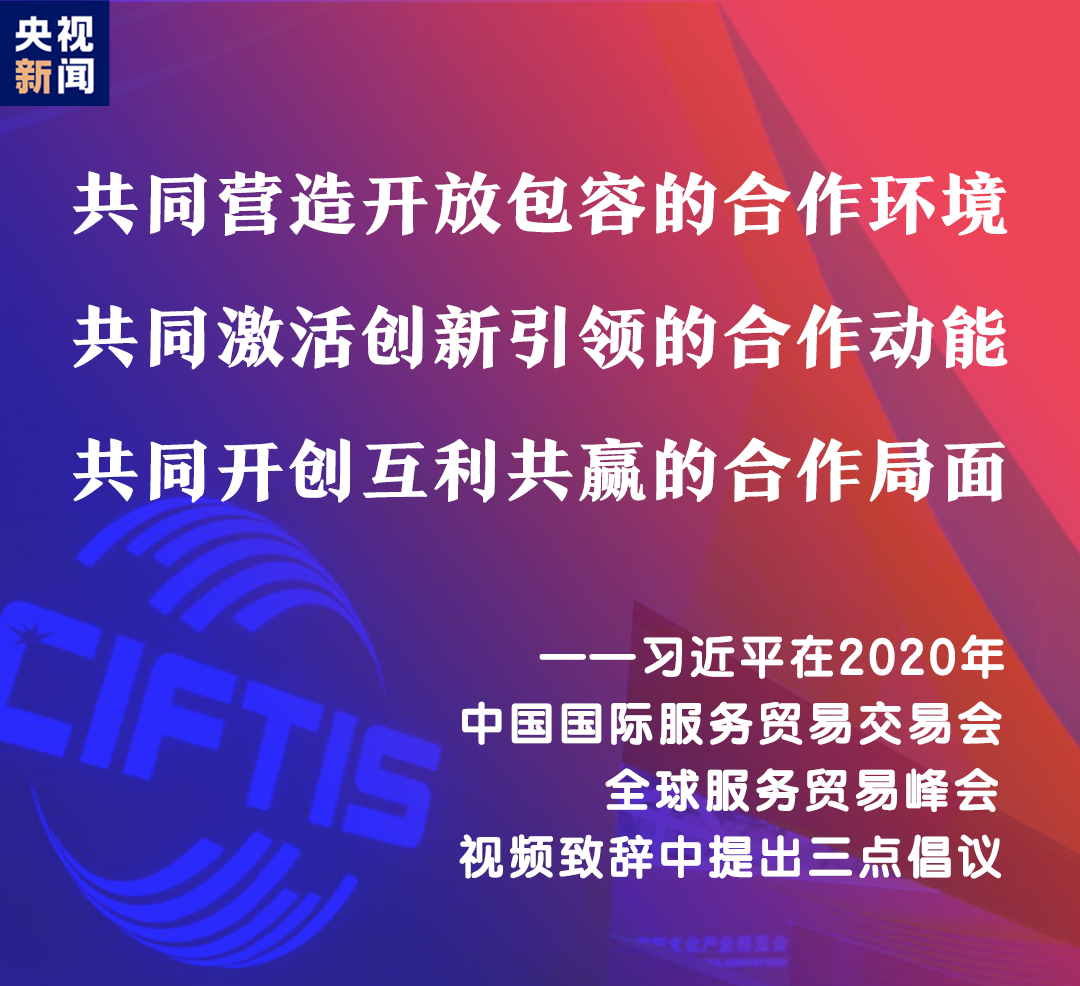 習(xí)近平表示,中國舉辦2020年中國國際服務(wù)貿(mào)易交易會,就是搭建起平臺和橋梁,讓各國人民充分展示服務(wù)貿(mào)易領(lǐng)域新發(fā)展新突破,共同享受人類社會發(fā)展進步新技術(shù)新成果。