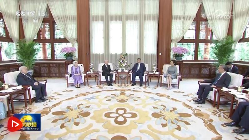 8月26日上午,國家主席習(xí)近平和夫人彭麗媛在北京中南海親切會見柬埔寨國王西哈莫尼和太后莫尼列。