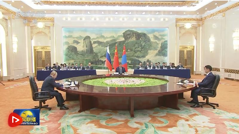 9月2日上午,國家主席習(xí)近平同俄羅斯總統(tǒng)普京、蒙古國總統(tǒng)呼日勒蘇赫在北京人民大會堂舉行中俄蒙三國元首第七次會晤。