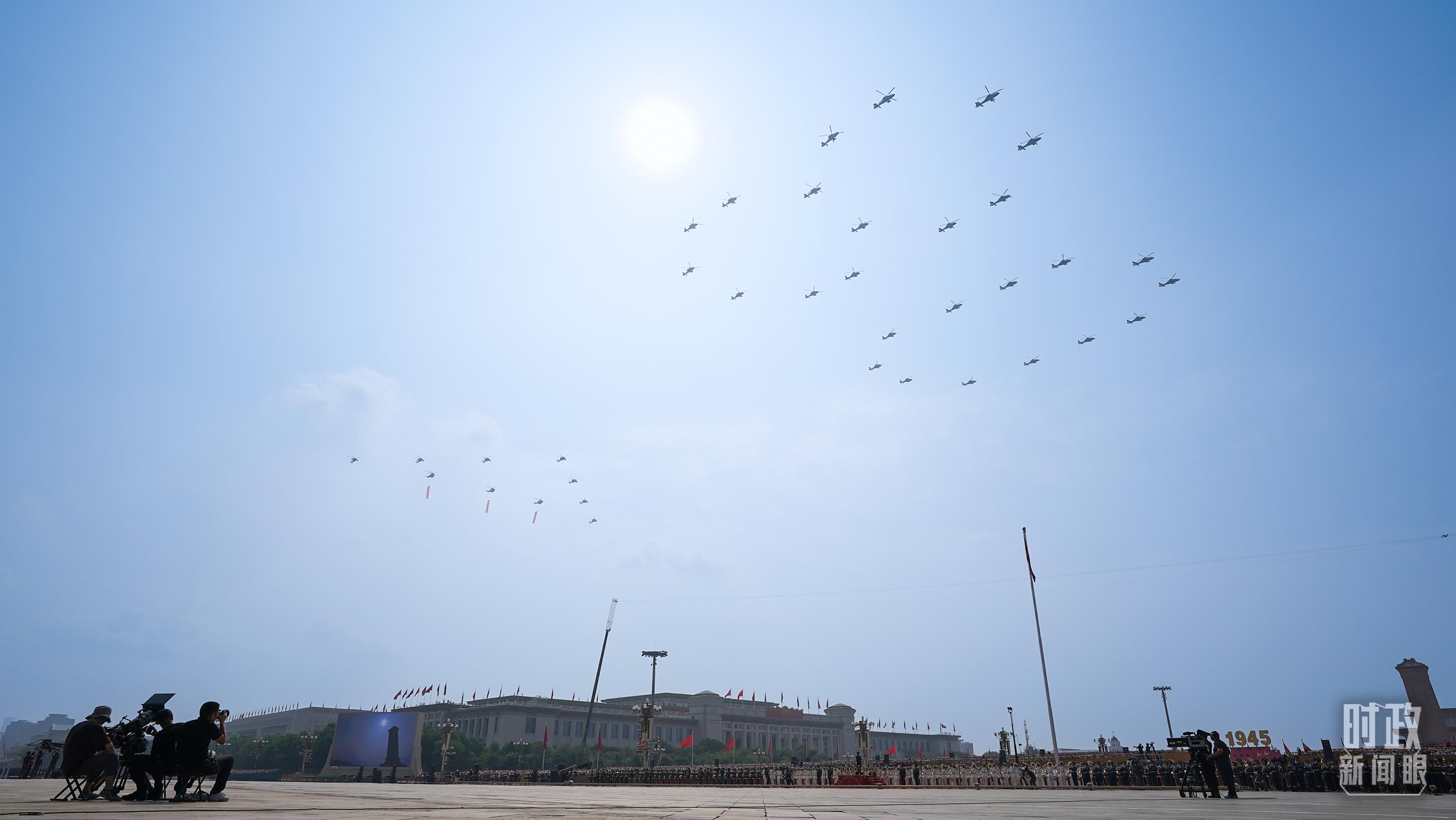 △9月3日,3架直升機分別懸掛“正義必勝”“和平必勝”“人民必勝”條幅飛過天安門廣場。(總臺記者李晉拍攝)