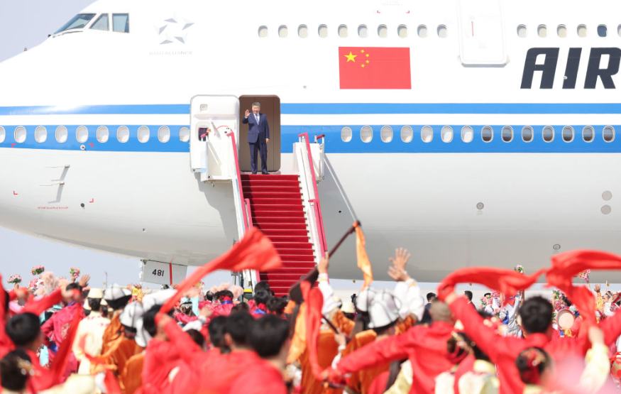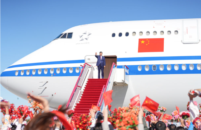 習(xí)近平總書記走出艙門,向歡迎群眾揮手致意。