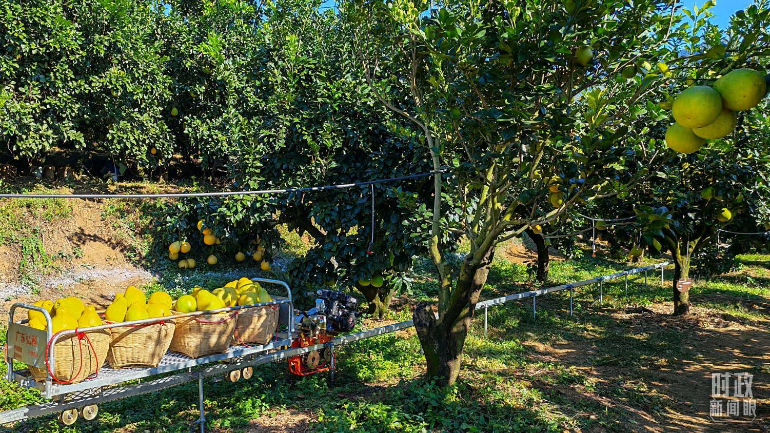 △金柚采摘運(yùn)送用上了無人軌道車,可大大減輕人力負(fù)擔(dān)。(總臺央視記者郭鴻拍攝)