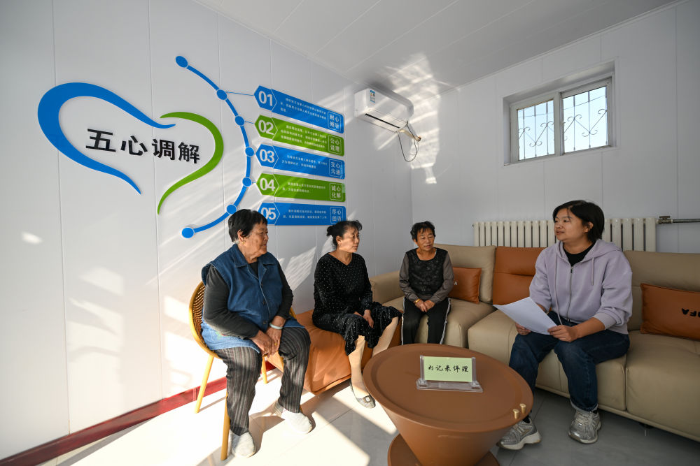 在天津市寧河區(qū)蘆臺(tái)街道金華路社區(qū),社區(qū)黨總支副書記吳蕊(右一)就社區(qū)監(jiān)控設(shè)備安裝問(wèn)題為社區(qū)居民進(jìn)行解答(2024年10月11日攝)。金華路社區(qū)積極踐行新時(shí)代“楓橋經(jīng)驗(yàn)”,將原社區(qū)居委會(huì)閑置用地提升改造成為聯(lián)絡(luò)群眾的基層綜合治理陣地——“解鈴小院”。新華社記者 孫凡越 攝