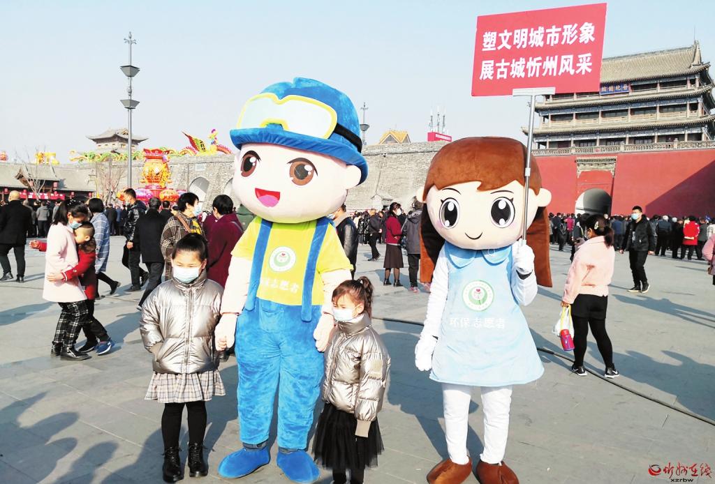 2月26日,農(nóng)歷辛丑年元宵節(jié),忻州古城北城門樓廣場(chǎng)上,兩名卡通形象裝扮的環(huán)保志愿者向群眾宣傳環(huán)保政策法規(guī),倡導(dǎo)環(huán)保過(guò)節(jié)、文明旅游。為豐富和活躍群眾文化生活,展現(xiàn)忻州古城保護(hù)活化新成就,元宵節(jié)期間,忻州古城舉行了社火游行,吸引了廣大市民。忻州市環(huán)保志愿者協(xié)會(huì)借機(jī)組織了環(huán)保宣傳活動(dòng)。 (張劍雄 攝)