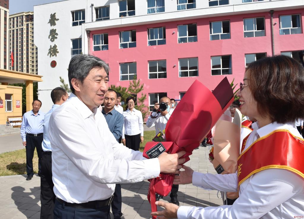 每到一處,朱曉東都與教師們深入交流,了解學(xué)校建設(shè)發(fā)展情況,關(guān)切詢問他們的工作生活情況,感謝他們?yōu)槲沂薪逃聵I(yè)發(fā)展作出的貢獻(xiàn),并為優(yōu)秀教師代表送上了鮮花,祝他們節(jié)日快樂。朱曉東指出,新一屆省委、省政府作出構(gòu)建“一群兩區(qū)三圈”城鄉(xiāng)區(qū)域發(fā)展新格局的重大戰(zhàn)略部署,明確提出“強(qiáng)勢(shì)打造太忻一體化經(jīng)濟(jì)區(qū)北引擎,引領(lǐng)帶動(dòng)忻州與太原、雄安新區(qū)相向發(fā)展,打造我省融入京津冀和服務(wù)雄安新區(qū)的重要走廊”,賦予忻州“建設(shè)開放發(fā)展前沿城市”的戰(zhàn)略定位,忻州發(fā)展迎來了前所未有、千載難逢的重大機(jī)遇。不論是太忻一體化經(jīng)濟(jì)區(qū)建設(shè),還是建設(shè)開放發(fā)展前沿城市,都離不開人才的支撐。希望廣大教育工作者身在學(xué)校、心系全局,秉持“負(fù)責(zé)任、動(dòng)腦筋、講良心”的工作要求,潛心教學(xué)鉆研、立德樹人,以更加飽滿的熱情投身教育事業(yè),為忻州經(jīng)濟(jì)社會(huì)發(fā)展培養(yǎng)更多的優(yōu)秀人才。