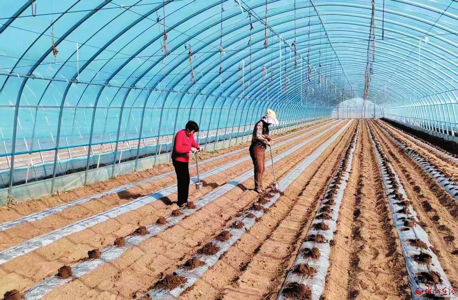 陽春三月,春風拂過雙乳山,西大王村的豆角產業(yè)園迎來豆角種植好時機。大棚里,六七個工人有序作業(yè),有的在點坑穴,有的在撒種、填土。一個大棚種好后,打開閥門,水流順著地上的滴管涌到坑穴,為剛撒下的種子提供水分。據了解,西大王村采用“黨支部+集體經濟合作社+農戶”的發(fā)展模式,既為集體增收,又讓村民受益。今年,豆角種植園區(qū)一共有13個大棚,占地約40畝。為了搶抓農時,提前上市,賣個好價格,此次播種雇了許多村民幫忙,播種大約需要半個月時間才能完成。