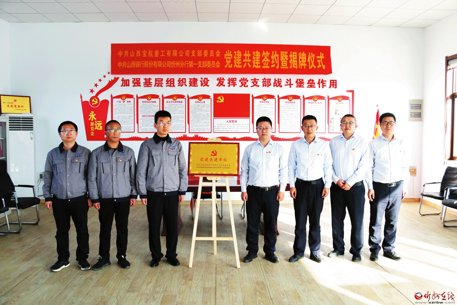 山西銀行忻州分行第一黨支部負(fù)責(zé)人、山西寶航重工有限公司負(fù)責(zé)人共同為“黨建共建單位”揭牌,共同簽署了黨建共建協(xié)議。