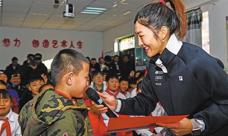 徐夢桃(右)在內(nèi)蒙古阿爾山市白狼鎮(zhèn)白狼小學為當?shù)匦W生普及滑雪知識(二〇一八年十二月攝)。新華社記者 劉 磊攝