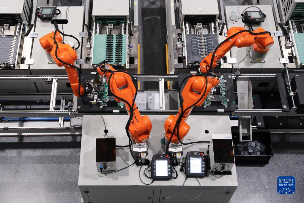 5月22日,在紫光恒越(杭州)技術(shù)有限公司“未來工廠”,機(jī)械臂在工作中。新華社記者 杜瀟逸 攝