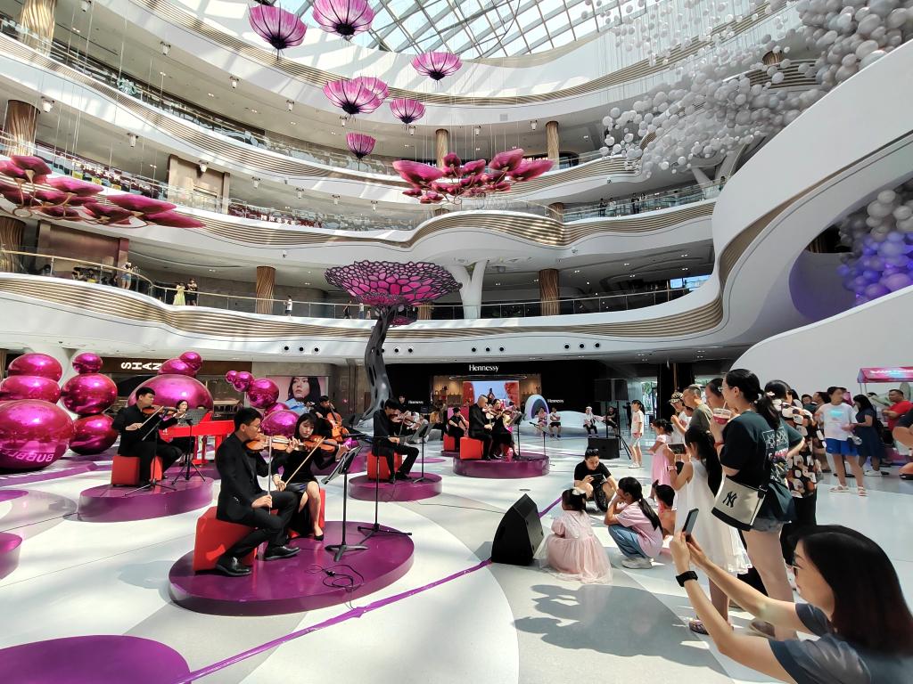 端午假期,海口國際免稅城內(nèi),伴隨著悠揚(yáng)的音樂,陽光傾瀉“天際秘林”夢(mèng)幻舞臺(tái),正在購物的游客們紛紛駐足欣賞?!耙粓?chǎng)室內(nèi)音樂會(huì),給購物消費(fèi)增添了新意和氛圍感。”??谑忻耜惱俪两陉柟夂鸵魳分小?/p>