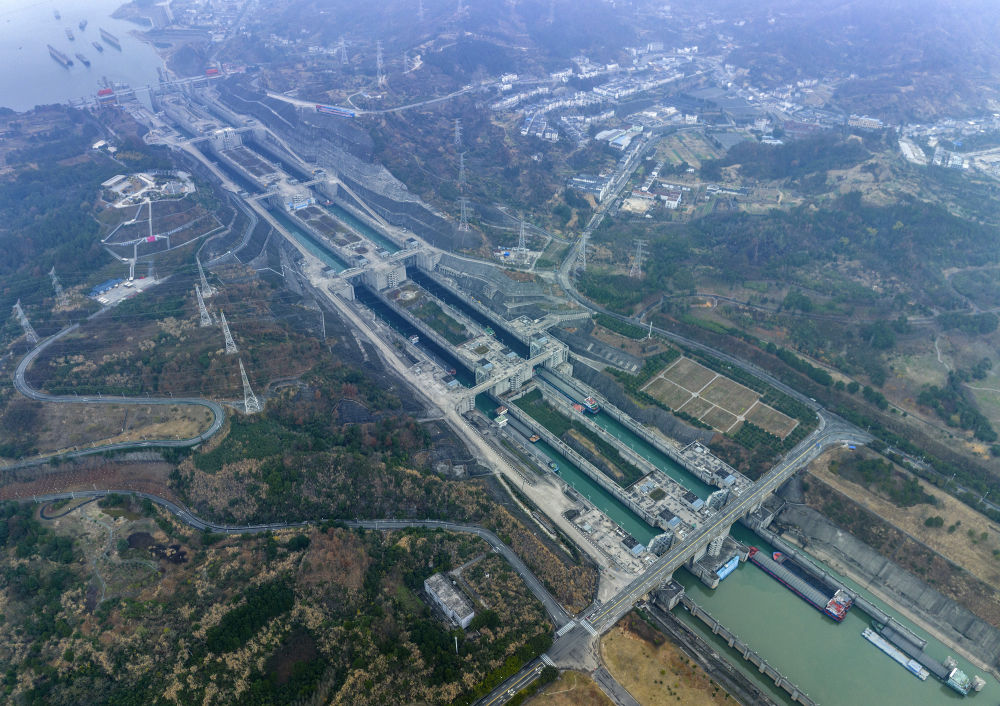 在湖北省宜昌市,船舶有序通過三峽樞紐五級(jí)船閘(2023年1月2日攝,無(wú)人機(jī)照片)。新華社發(fā)(王罡 攝)