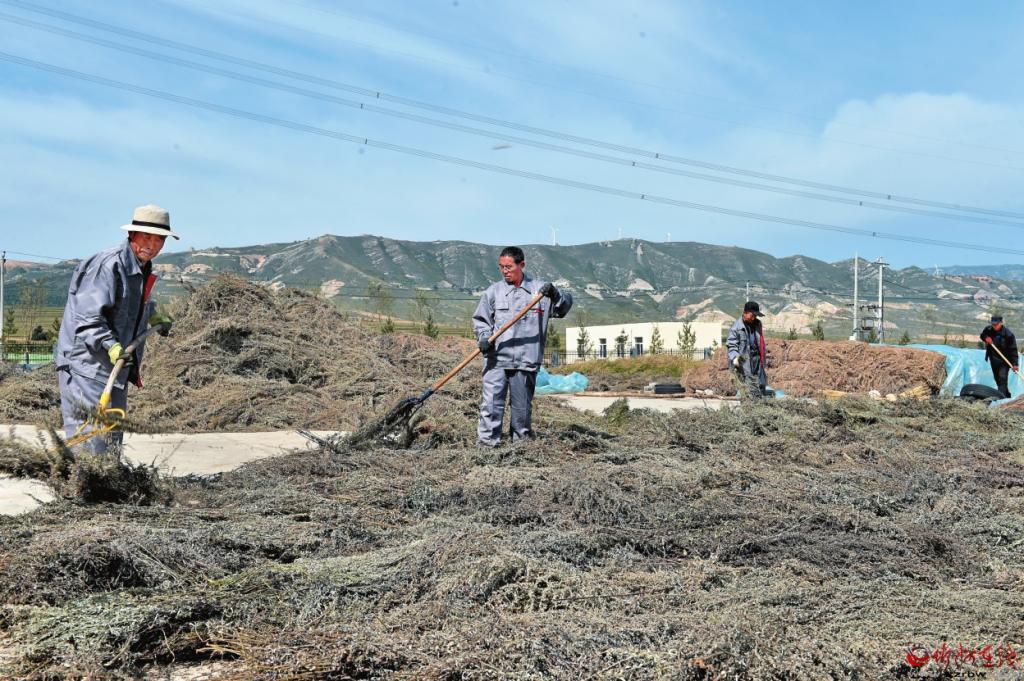 在康茂高原生物科技股份有限公司院內(nèi),工人們正在翻曬艾草。 記者 馮曉磊攝