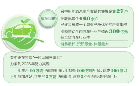 目前,晉中正在打造“一區(qū)兩園三體系”,即以國家級甲醇經(jīng)濟示范區(qū)為引領(lǐng),以汽車裝備制造園和綠色甲醇循環(huán)經(jīng)濟產(chǎn)業(yè)園為支撐,形成核心主導(dǎo)產(chǎn)業(yè)、支撐服務(wù)產(chǎn)業(yè)、示范應(yīng)用場景三大產(chǎn)業(yè)體系。力爭到2025年努力實現(xiàn)年生產(chǎn)10萬輛甲醇乘用車、年制備100萬噸甲醇、建成100座以上甲醇加注站、年生產(chǎn)5萬輛甲醇重卡、建成5個甲醇經(jīng)濟小鎮(zhèn)目標(biāo),建設(shè)“車、醇、運、站、捕”全鏈條的經(jīng)濟生態(tài),打造原料生產(chǎn)、汽車制造、服務(wù)配套、基礎(chǔ)支撐、場景應(yīng)用的全產(chǎn)業(yè)鏈?zhǔn)痉堵肪€,推動甲醇汽車應(yīng)用規(guī)模向萬輛進軍,打造千億級甲醇經(jīng)濟高能級產(chǎn)業(yè)版圖。