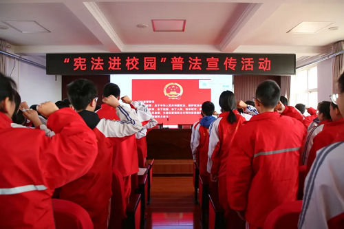 “我宣誓:忠于中華人民共和國憲法,維護憲法權(quán)威,履行法定職責,忠于祖國、忠于人民……”授課結(jié)束后,全場人員緊握右拳,莊嚴宣誓,字字千鈞、擲地有聲的鏗鏘誓言在會場久久回蕩,充分表達了大家對憲法的信仰、尊崇與敬畏。隨后,法院干警向?qū)W生們發(fā)放了中院精心制作的憲法、平安建設、防范校園欺凌、未成年人保護、預防未成年人犯罪等法律知識宣傳手冊。