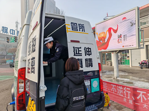 春節(jié)假期,城市、鄉(xiāng)村到處都彌漫著歡樂祥和的氣氛,初一至初七,在山西省忻州市忻府區(qū)光明西街古城北廣場(chǎng)、公園西街世紀(jì)花苑小區(qū)南門等人流量大、人員集中場(chǎng)所,忻州市公安局交警支隊(duì)的警郵車管便民服務(wù)車格外顯眼?!翱s短距離、延伸真情”,這輛承載著為駕駛?cè)颂峁崆橹艿椒?wù)、為車輛安全出行提供保障,被群眾稱為“流動(dòng)車管所”的車管便民服務(wù)車讓寒冬暖流涌動(dòng)。